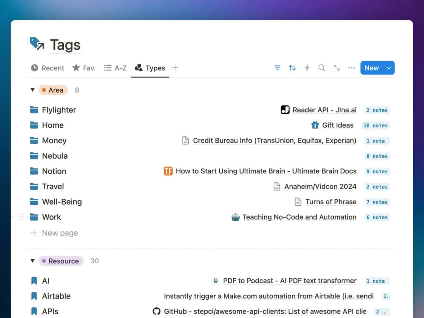 The powerful Tags database lets you create Areas and Resources – and using Notion’s database magic, Areas become much more useful than they are in other tools, containing Projects, Resources, and more.