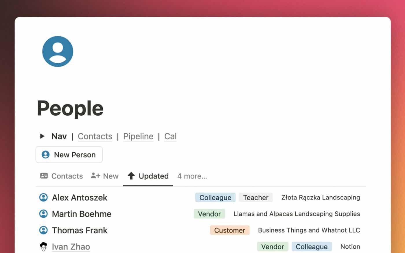 In most parts of the system you’ll actually use, you’ll see filtered views of these databases – e.g. a view of the Tasks database only showing the Tasks that are associated with a specific Project (you’d see this in the Project’s page).