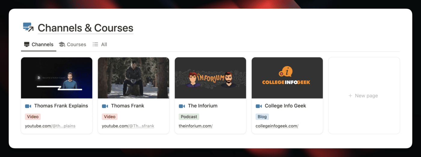 - Creator Tips – articles and videos that teach you useful creator skills (like my Creator Atlas). I’ve been collecting videos of this sort in a playlist for years, but collecting them in Notion means you can also save articles from other sites (and take notes on them).