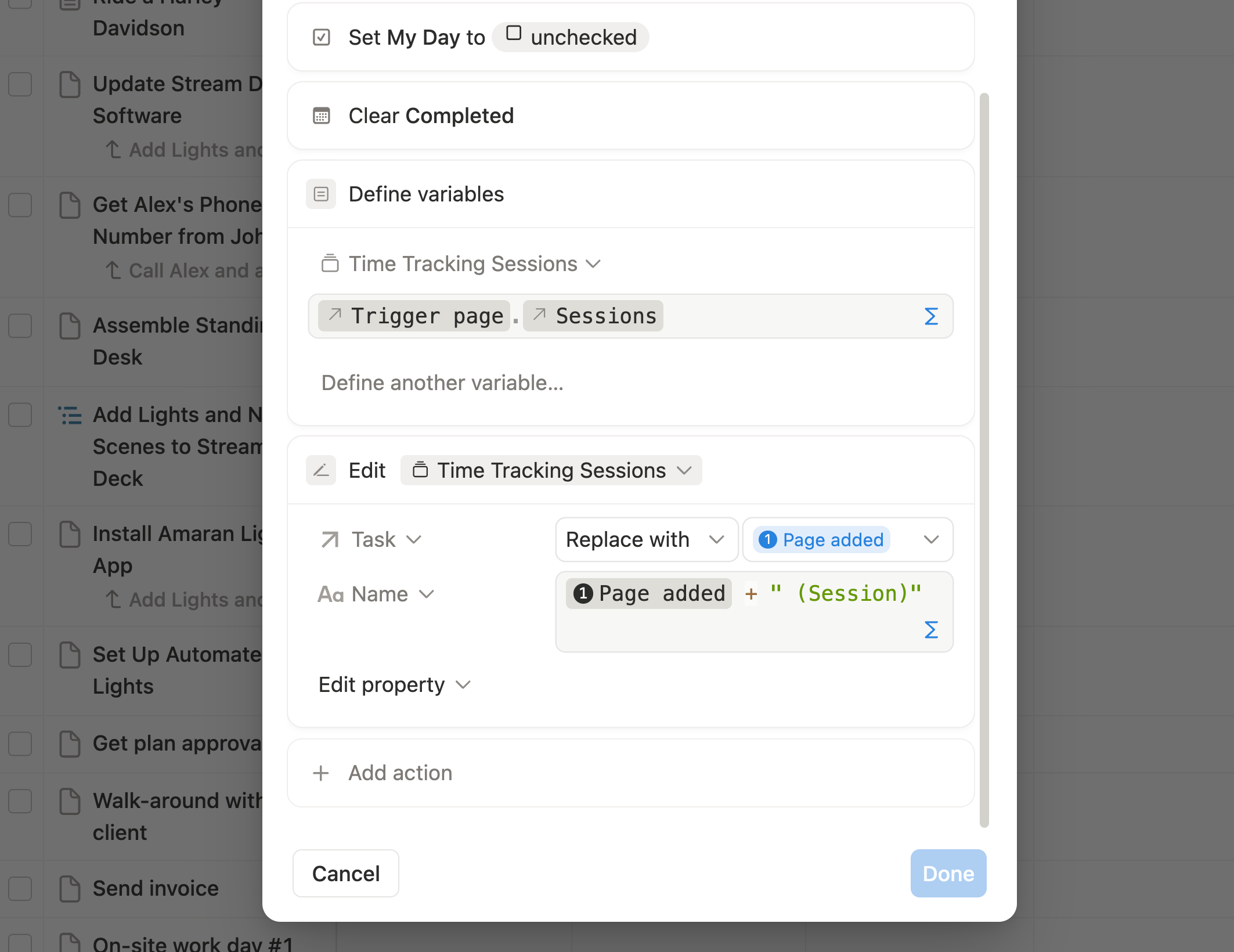- Description: When a task is set to Done, this automation ends any active Work Session related to it. This ensures time tracking sessions are ended when the task is completed.