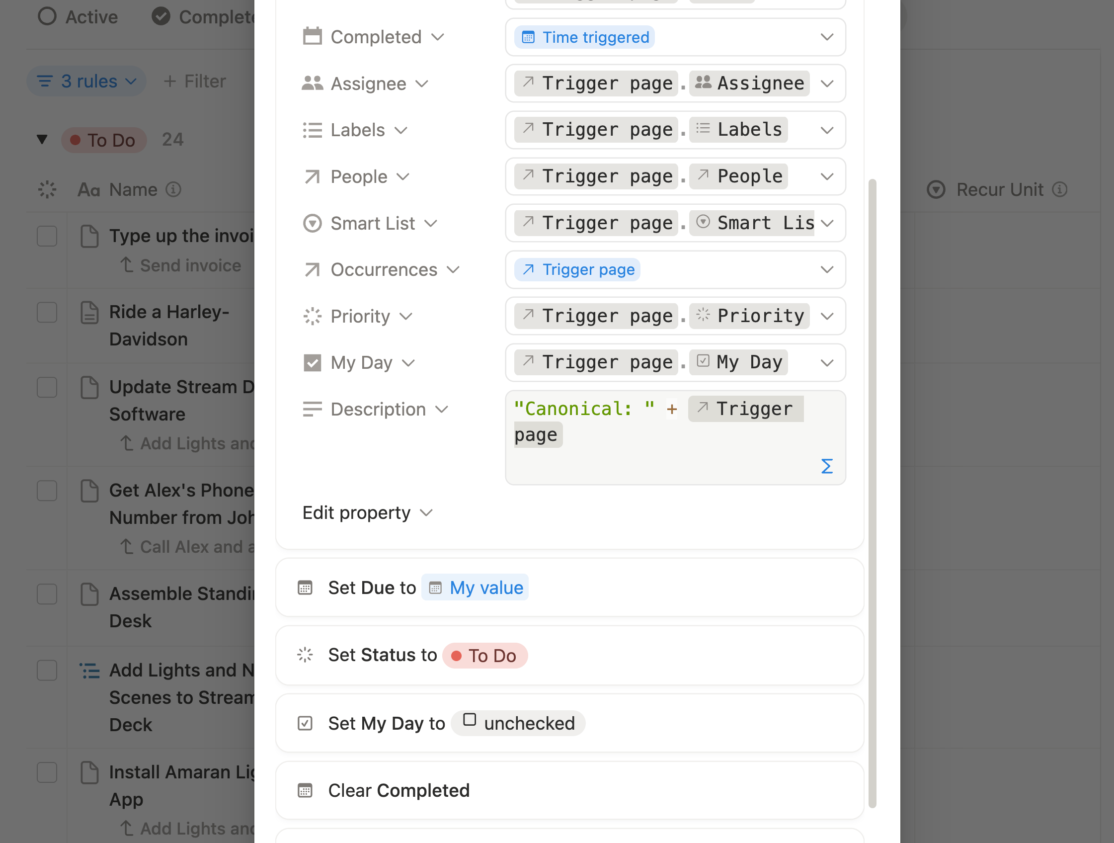 - Description: When a task is set to Done, sets the Completed date to Time Triggered.