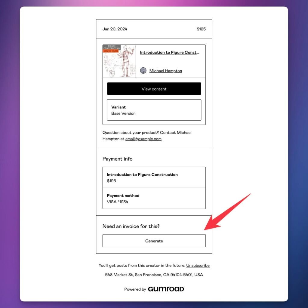 If you purchased a template from Gumroad, you’ll find a Generate Invoice link directly in your email receipt, as shown in Gumroad’s own docs on how to generate an invoice: