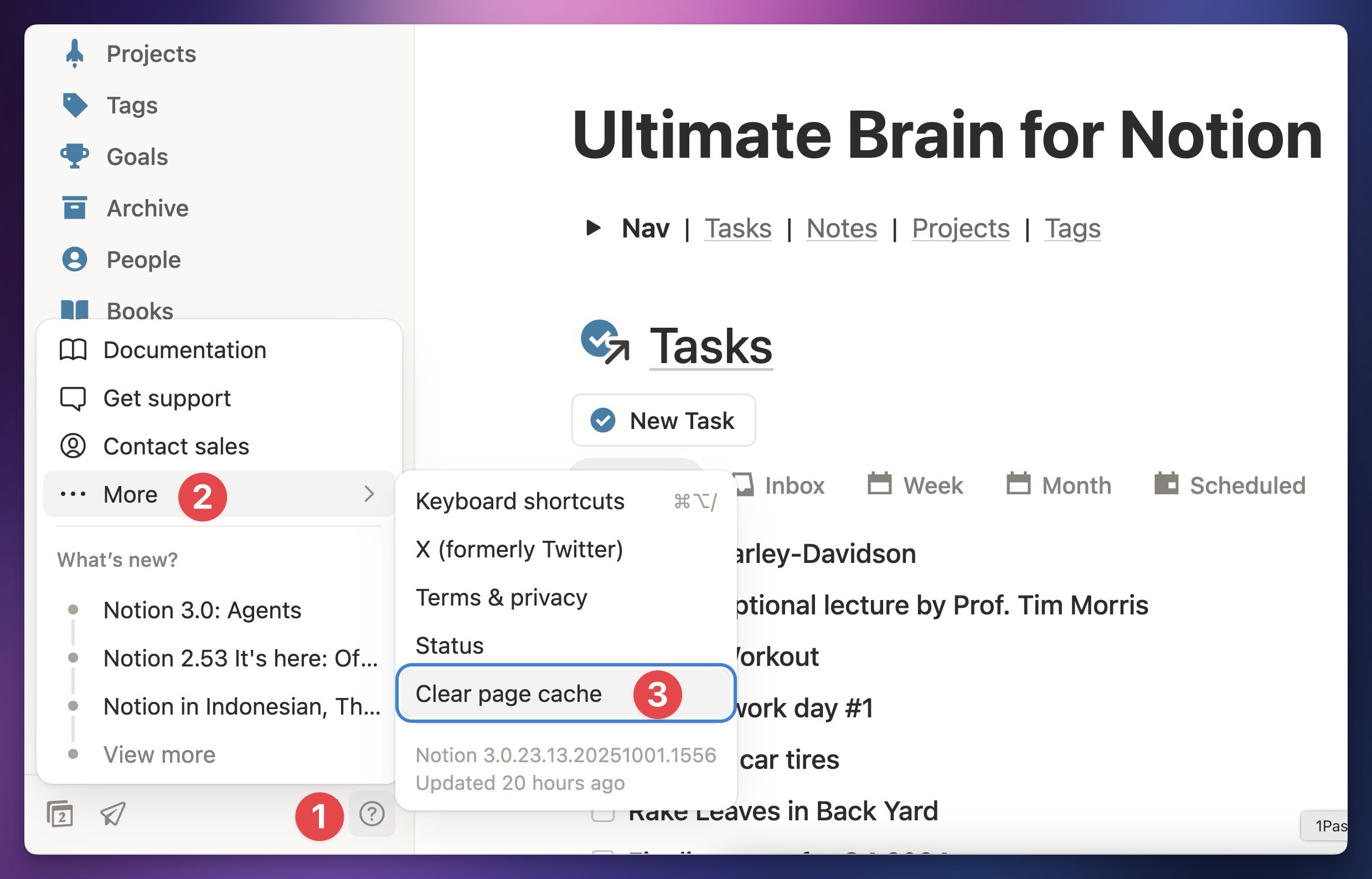 in the bottom-left corner → More → Clear Page Cache. - Try fully logging out of your Notion account, then logging back in.