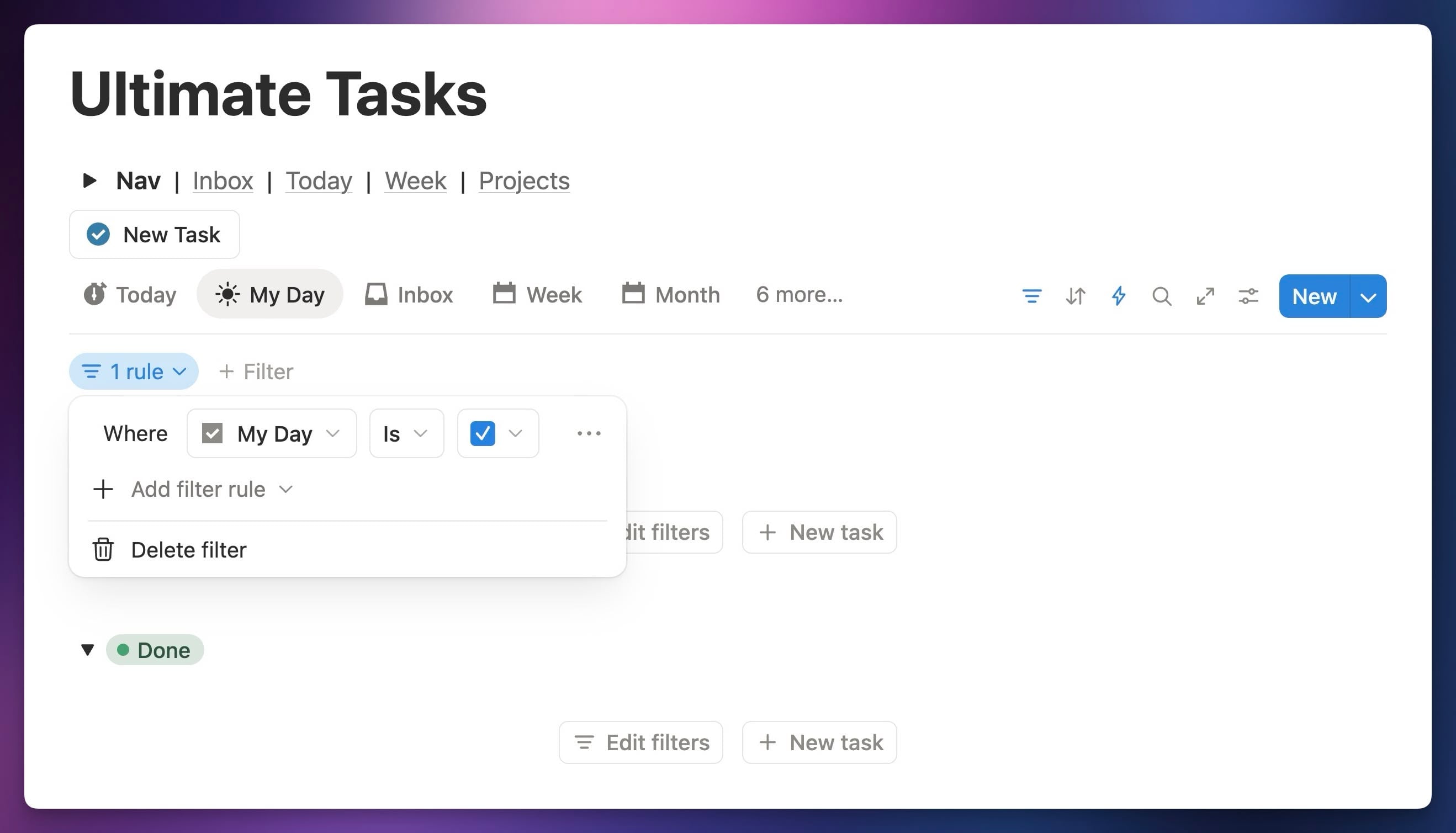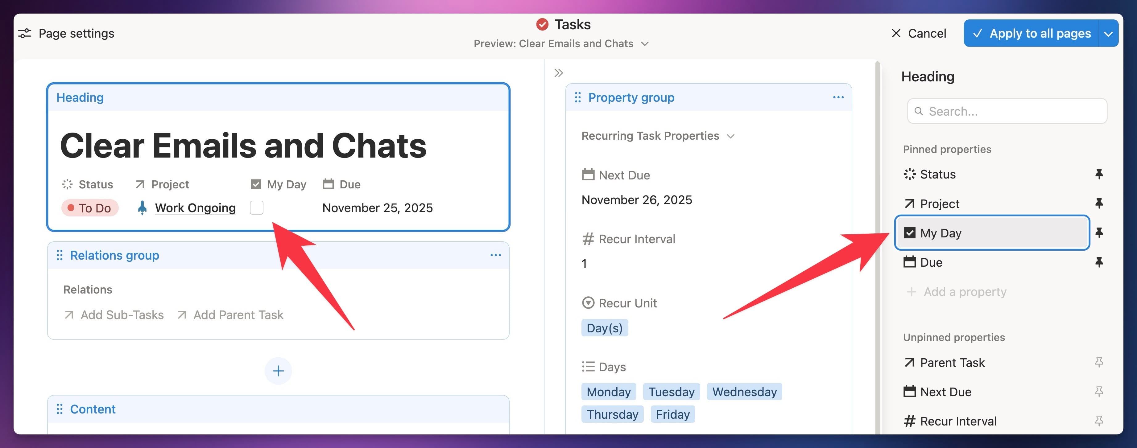 - Properties: Status, Task, [anything else you want], My Day (in that order)