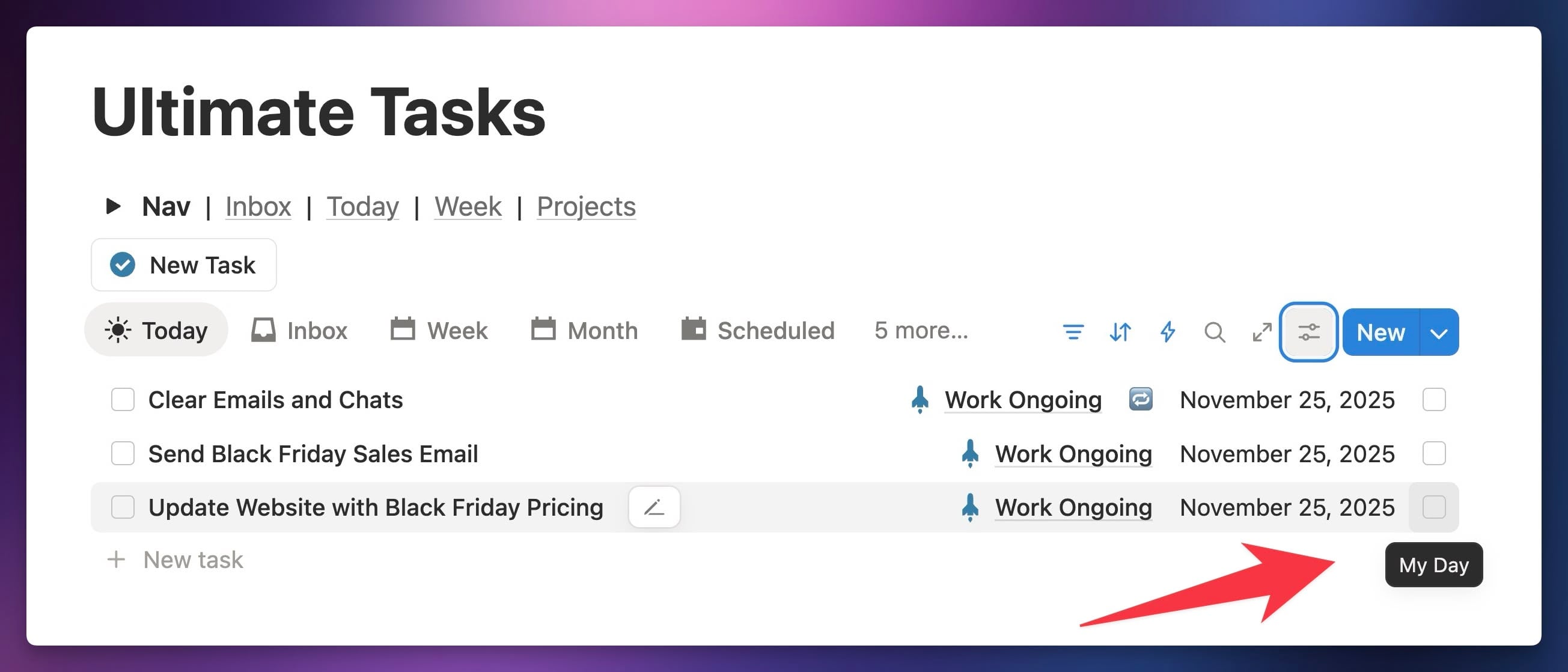 Under the hood, I’ve added a Checkbox property to my Tasks database called My Day. In this set of views, I’ve made that checkbox visible on the right side of each task.