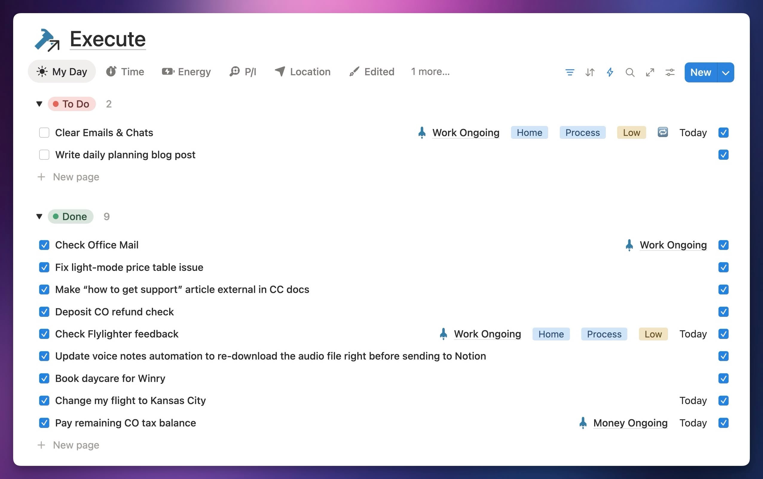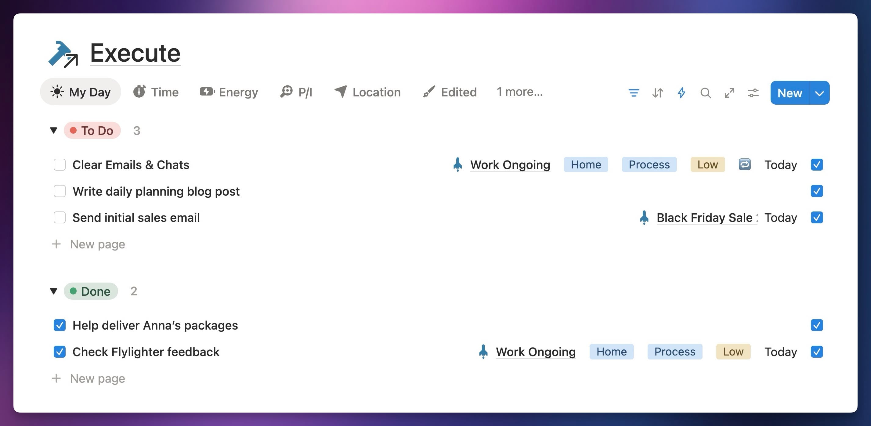 The Execute section also contains a linked database view connected to the Tasks database. However, it’s filtered to only show tasks that have the My Day checkbox checked.