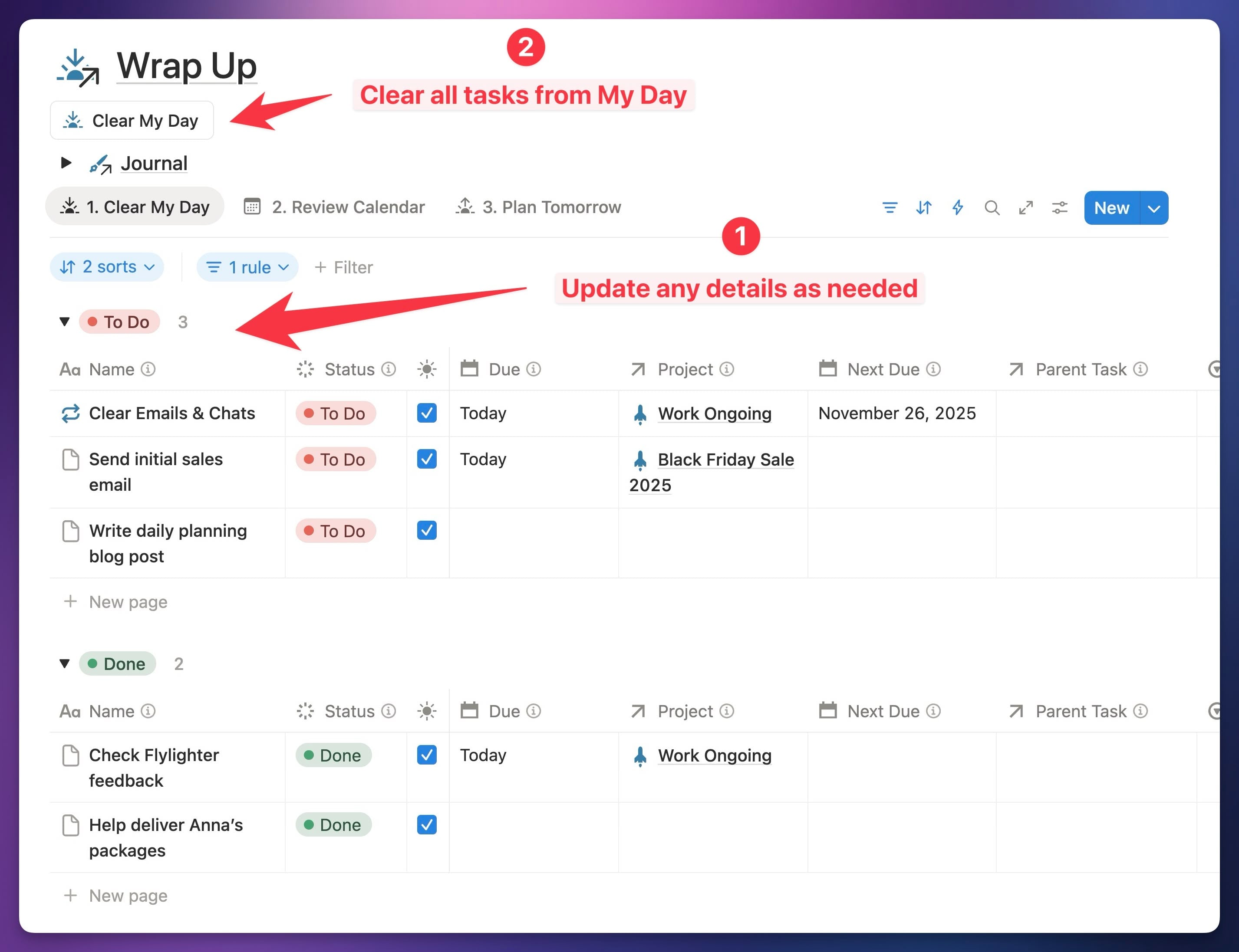 I’ll note that this isn’t much different from looking over any traditional task manager and simply writing down the tasks you’ll do today in a new Notion page, or on a sticky note, or on your arm. The key is simply to create a separate list of deliberately-chosen tasks. Doing it this way in Notion just makes the process seamless and fast.