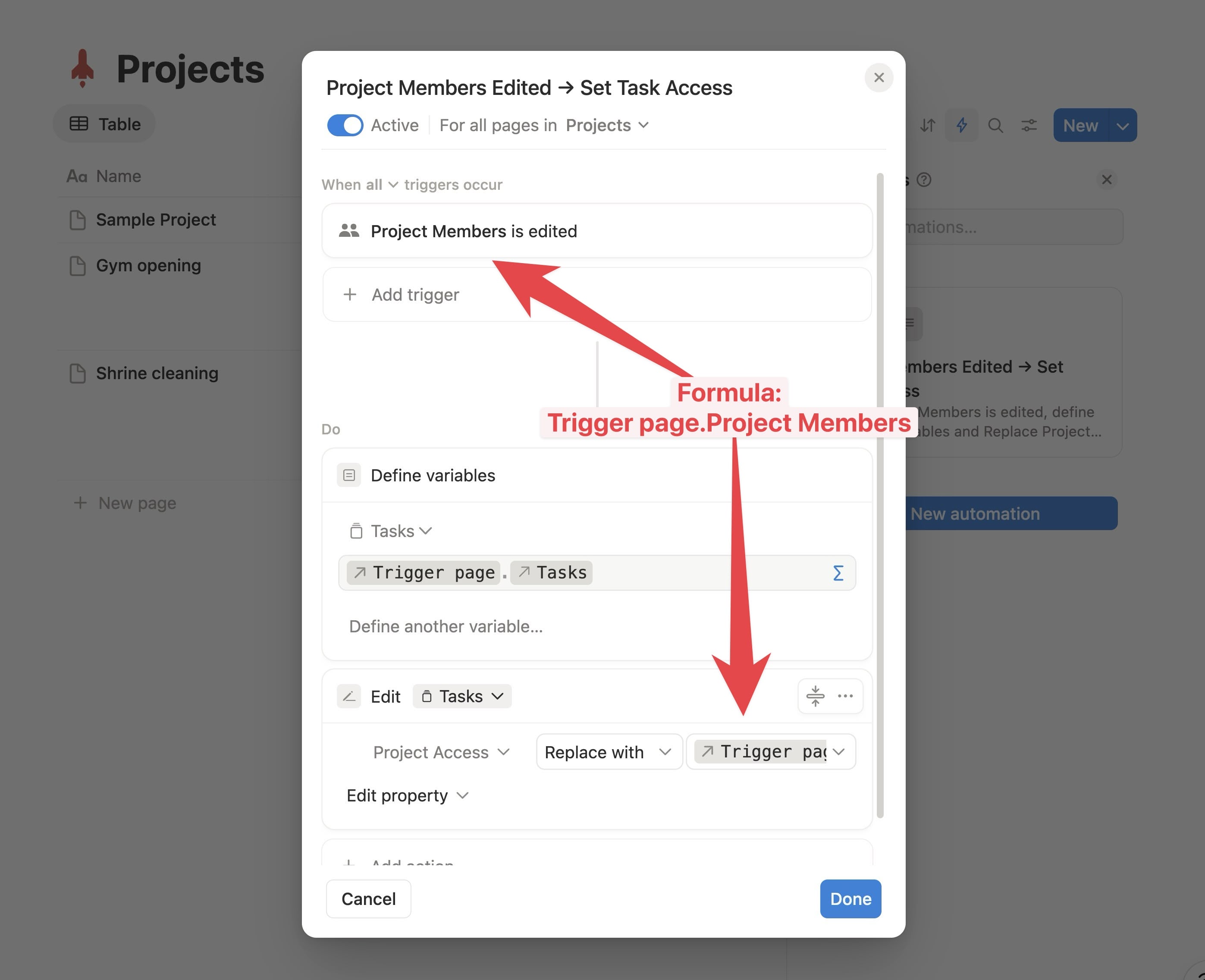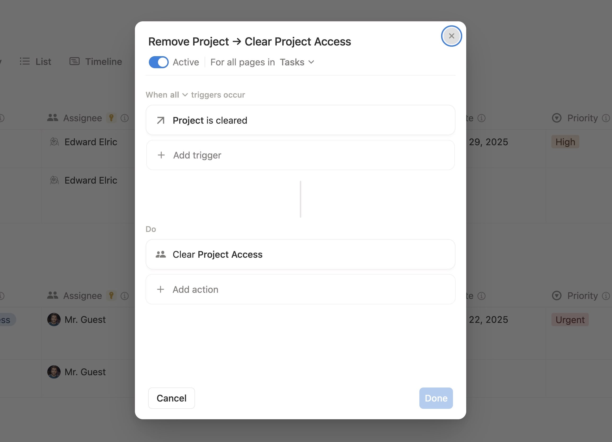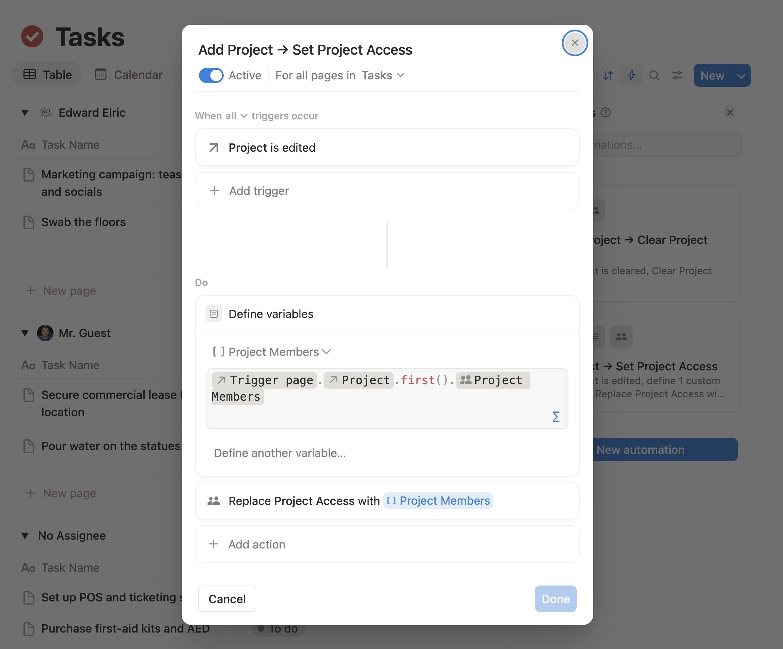 This can be really powerful. For example, this automation in a Projects database will automatically edit the permissions of every task related to a project when the project’s Project Members property is edited.