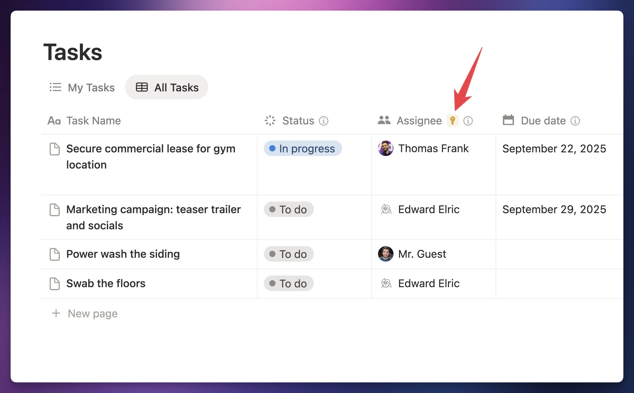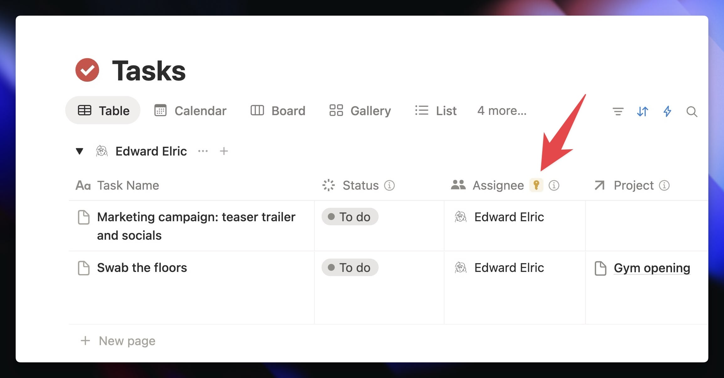 Here’s a quick look. See the yellow Key (🔑) icon in the Assignee property? This indicates that users set in that property will gain access to the page, even if they don’t have the same level of permission for the whole database.