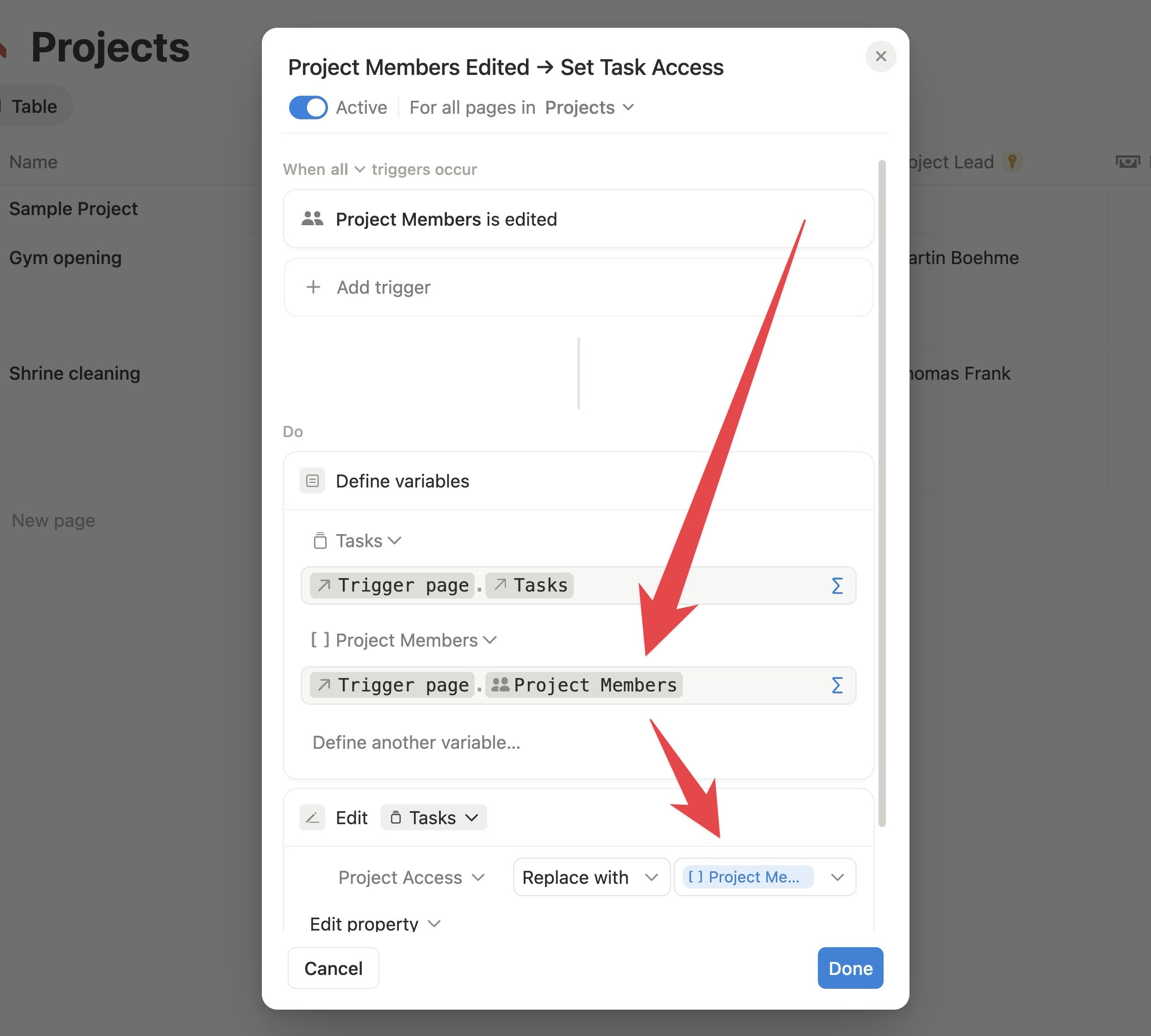 Three automations, to be exact. You can create this type of “access via Relation” through a set of three automations. You also need a set of matching Person-type properties on both databases. In the example below, the Projects database has a Project Members property, which is used to set the value of a Project Access property on the Tasks database.