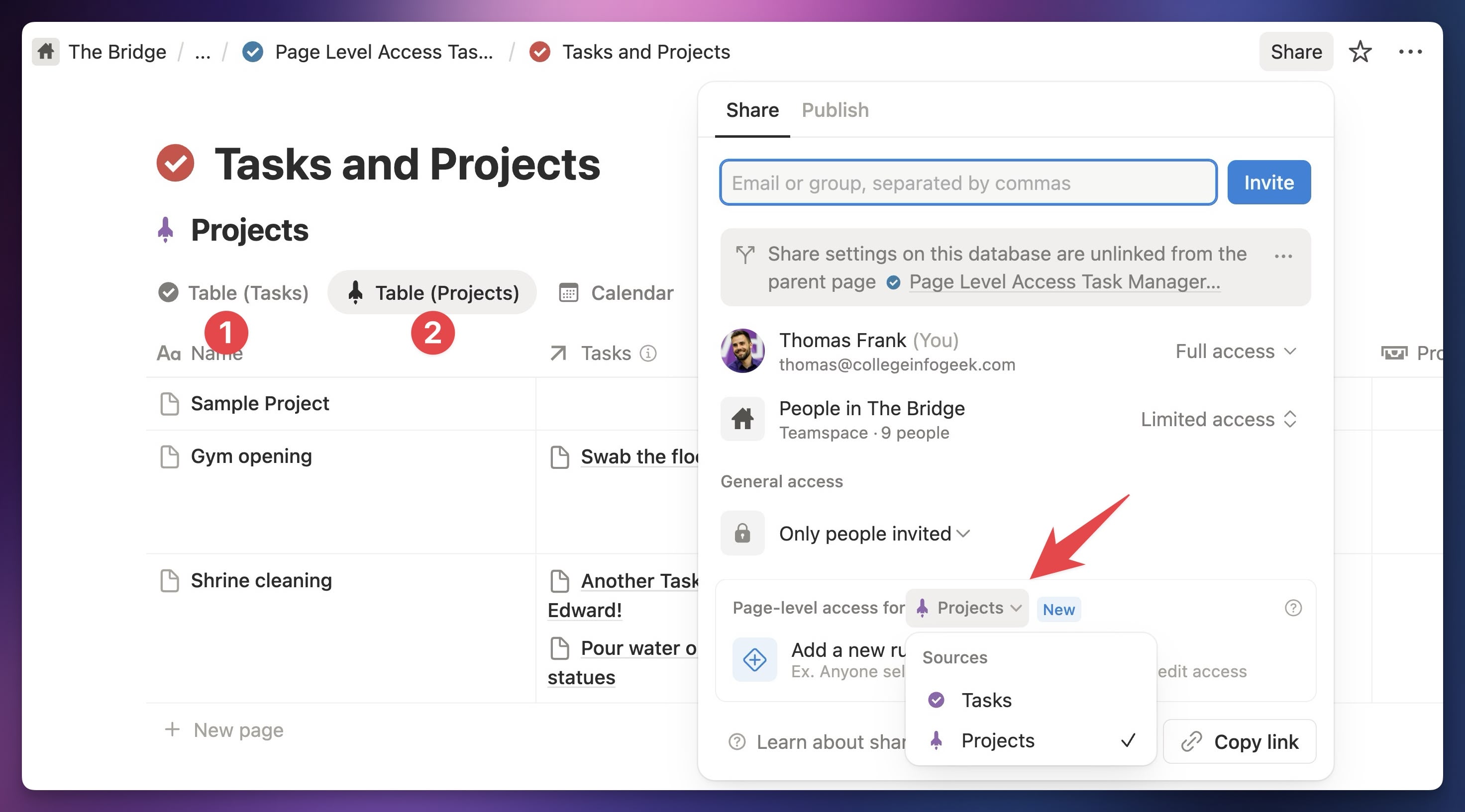 For example, here’s what our page-level access section looks like after I moved a Projects data source into our original Tasks database. As you can see, the database now contains two data sources – Tasks and Projects – and any rule I create only applies to the currently-selected data source.