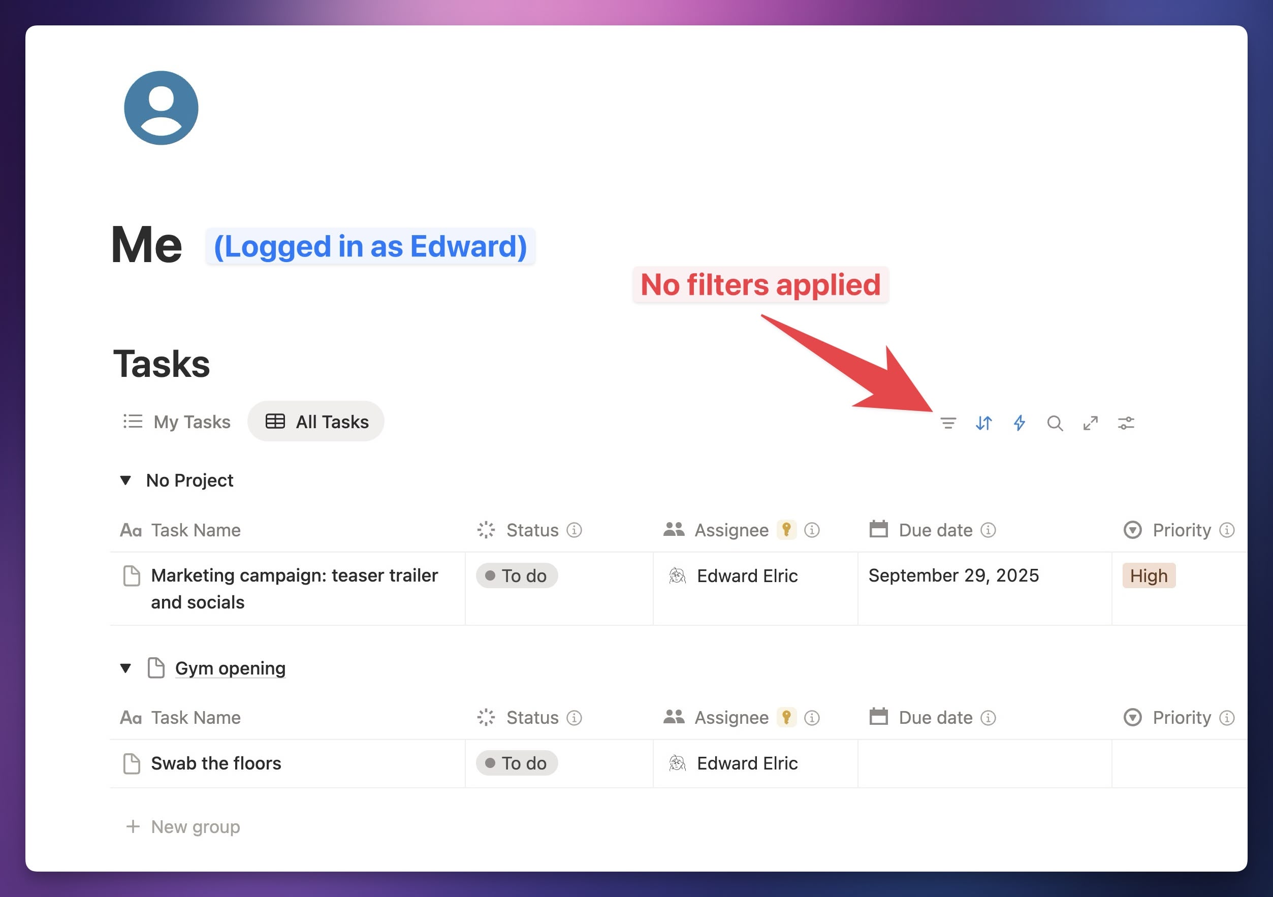 If I log into Notion as Edward (he won’t mind, being a fictional character and all), here’s what his view of the Tasks database looks like. Notice that there aren’t any filters applied to this view of the database! These two tasks are the only ones he can access.