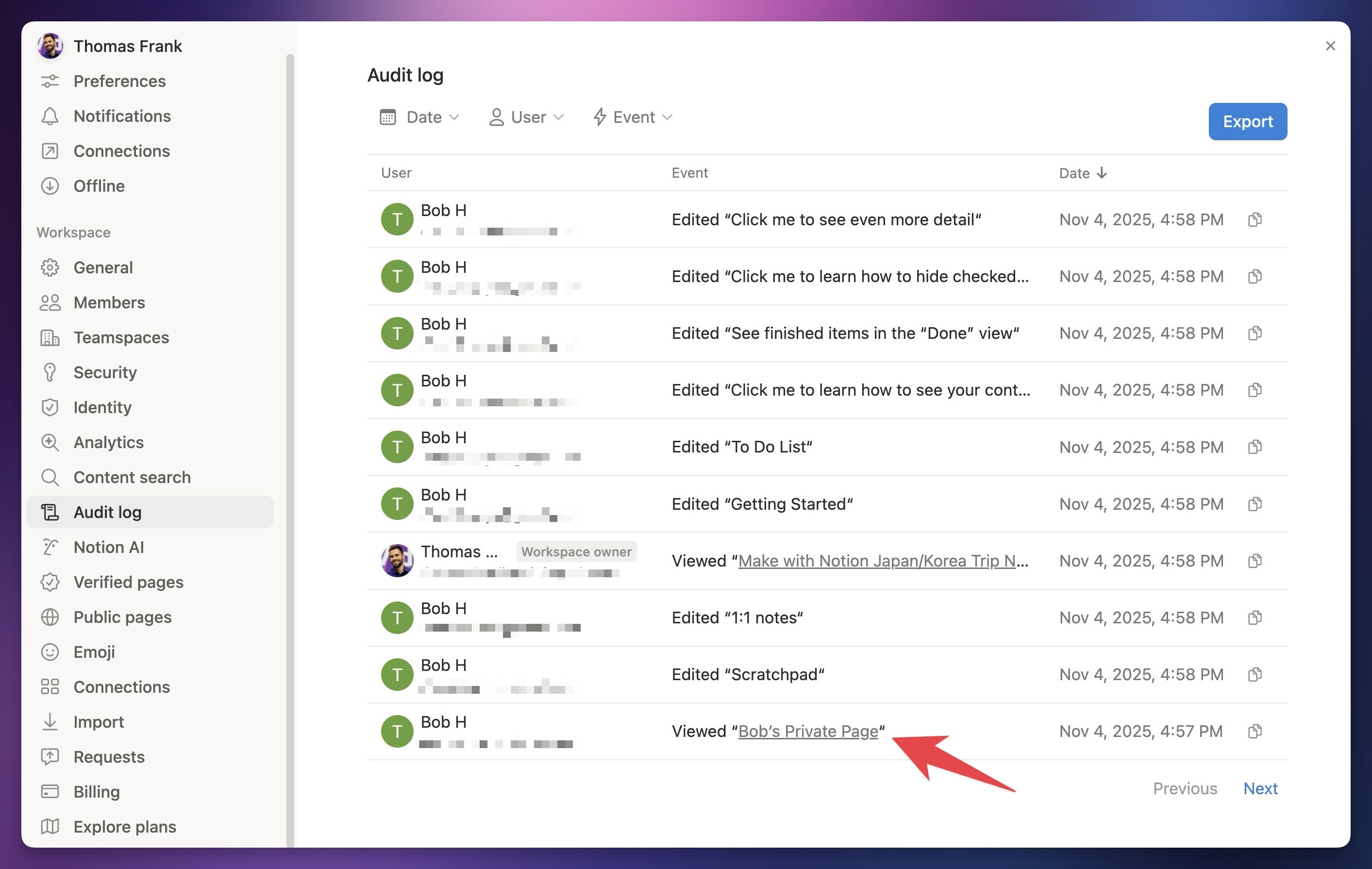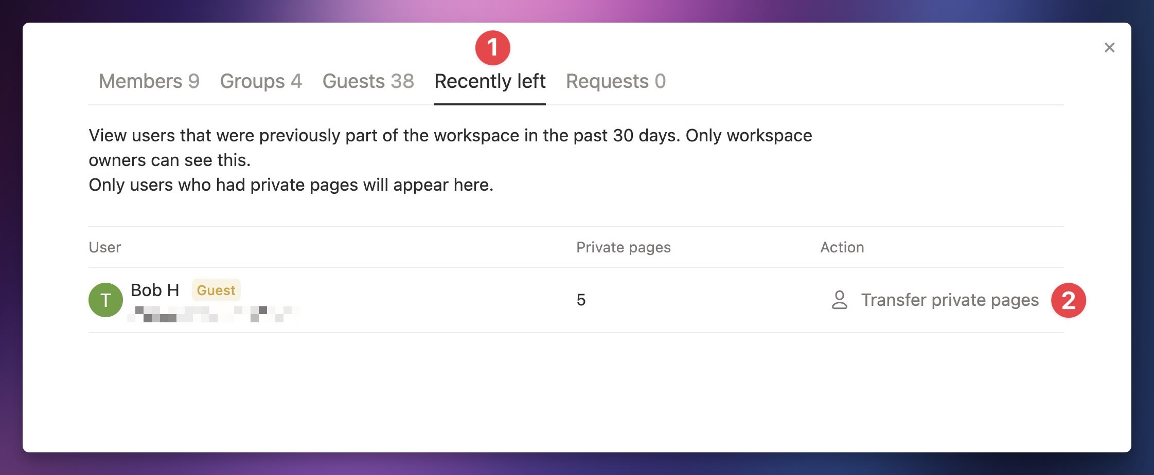 First, when Members are removed from a workspace, you’ll see their accounts listed in the Recently Left tab within Settings → Members. Here, you’ll find a Transfer Private Pages button. This allows you to transfer ownership of all pages to which the user had sole access. You can transfer to any other Member.