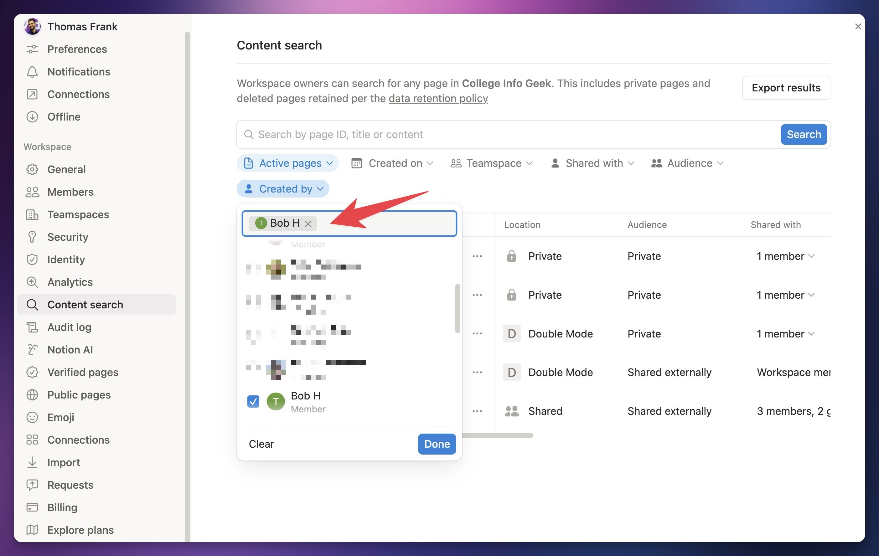 If a user is still in your workspace, you can also make it easier to find all of their pages by using the filters in Content Search. For example, you could filter by Shared with → [Guest User] to see all of a Guest’s accessible pages before you remove them from the workspace.